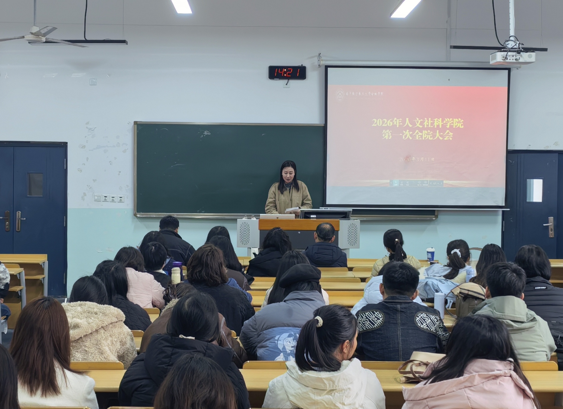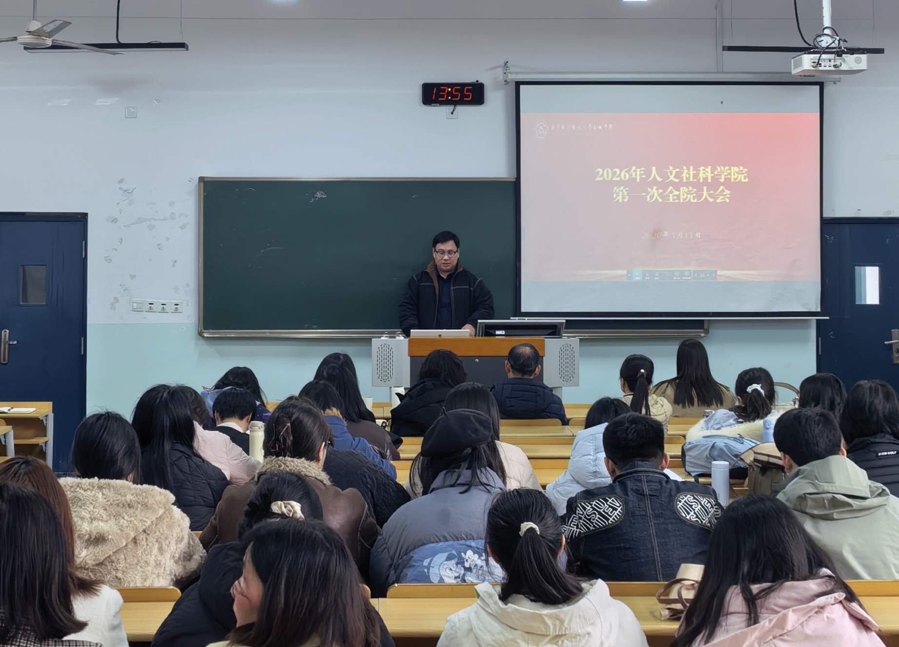 3月11日下午,人文社科学院2026年第一次全院大会在A4S102召开。院长王玉括、党总支书记李喆阳、党总支副书记宋雅、院长助理邢浩及全体教师出席会议。会议围绕2025年绩效考核总结、2026年重点工作规划、学生管理、教学安排等议题展开,为学院新一年高质量发展定方向、明思路、聚合力。